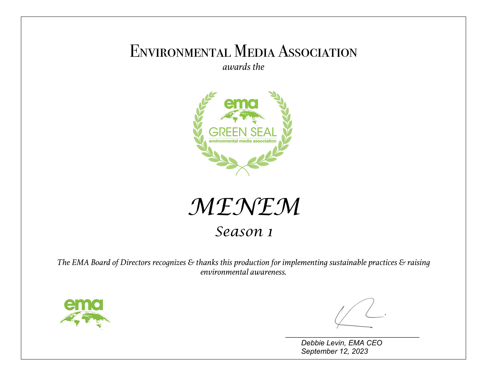 MENEM was awarded the Green Seal by the Environmental Media Association (EMA), marking the first time Argentina has received this important certification.